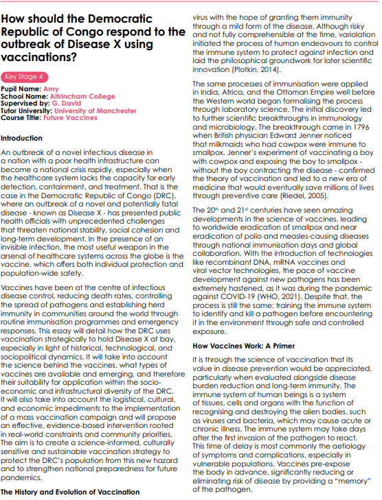 The hard-working Year 10 students produced a challenging university-style essay exploring future vaccines. They were encouraged to think and work independently across seven tutorials with a subject expert PhD researcher from the University of Manchester. During the programme, they learnt about the history and science of vaccines and then completed a challenging final essay which was given a university-level grade.