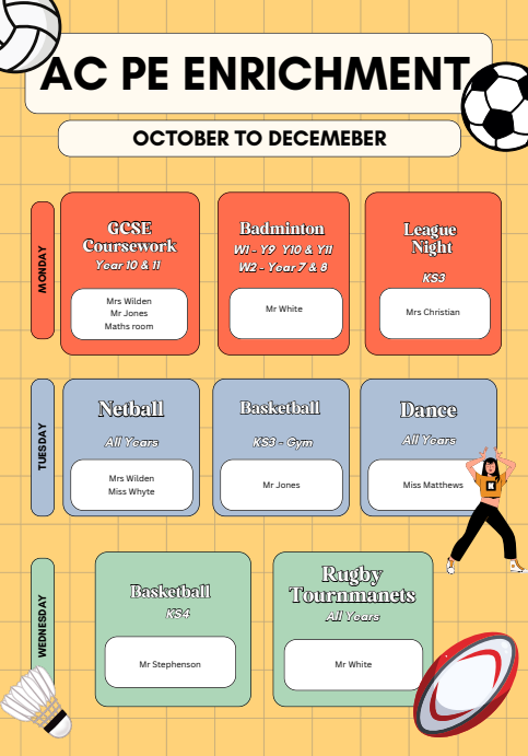 Enrichment activities take place after school, from 3.15 - 4.15pm (unless stated otherwise). Late buses are available Monday - Wednesday, departing school at 4.30pm. Please note that these services only follow the 777 and 773 bus routes.